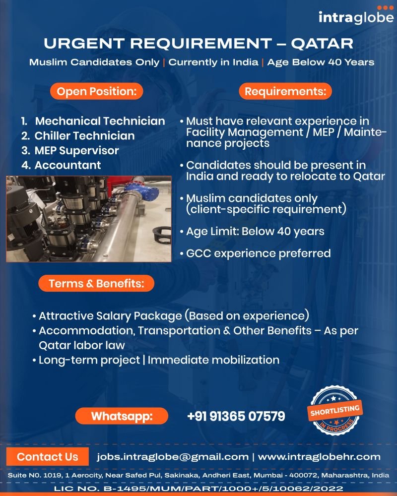 To Apply, Send your CV to jobs.intraglobe@gmail.com