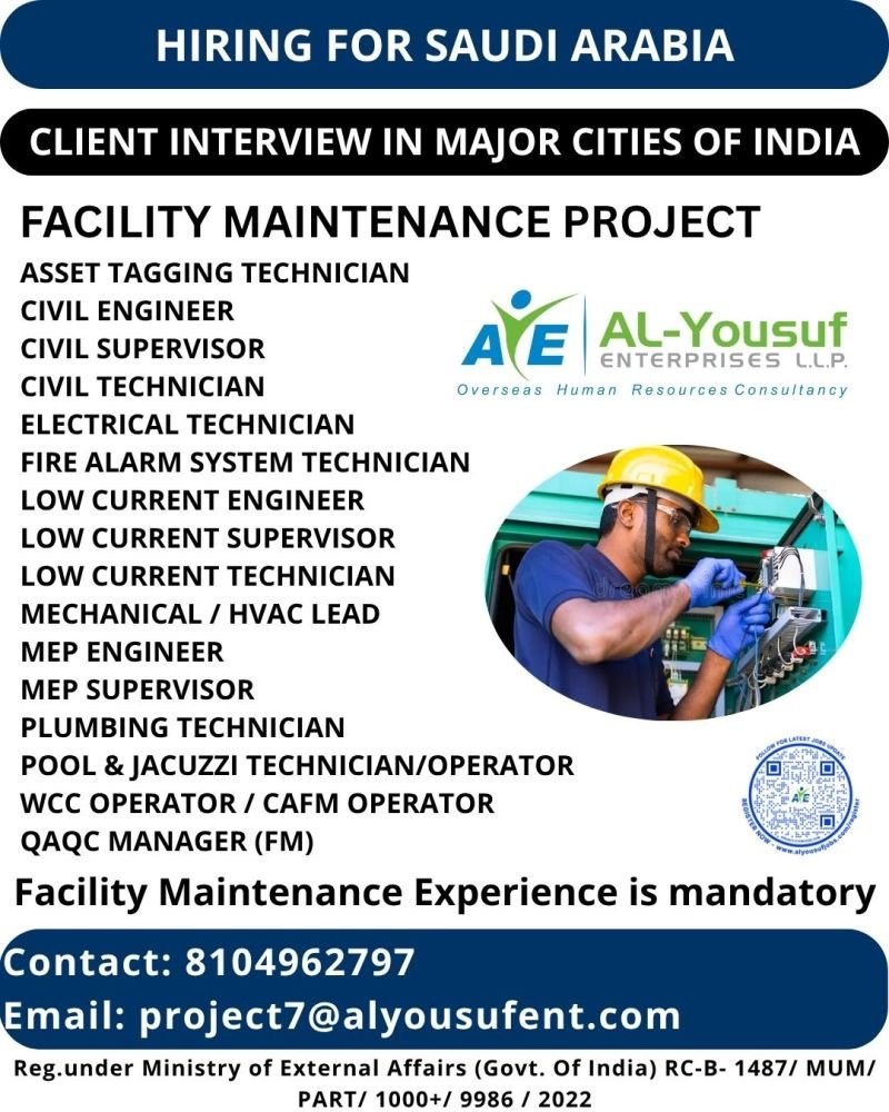 We are conducting Client Interviews across major cities in India for multiple Facility Maintenance positions.