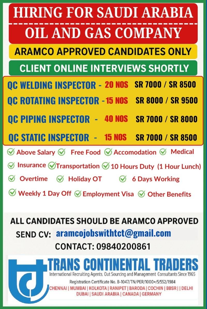 Looking for a rewarding career in the oil and gas sector? Trans Continental Traders is excited to announce hiring for Saudi Arabia Oil and Gas Company in 2025, exclusively for Aramco-approved candidates. Client online interviews are scheduled shortly—don’t miss your chance!