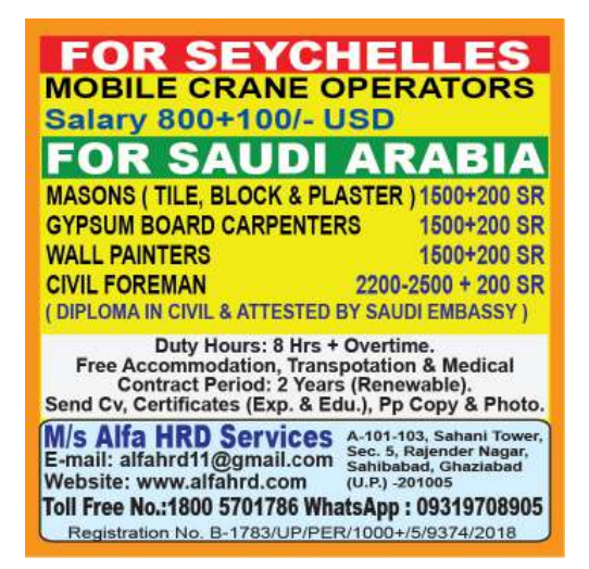Note: Civil Foreman must have Diploma in Civil Engineering and documents attested by Saudi Embassy.