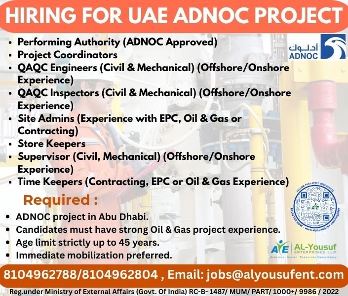 We are looking for qualified professionals with strong Oil & Gas project experience for ADNOC projects.