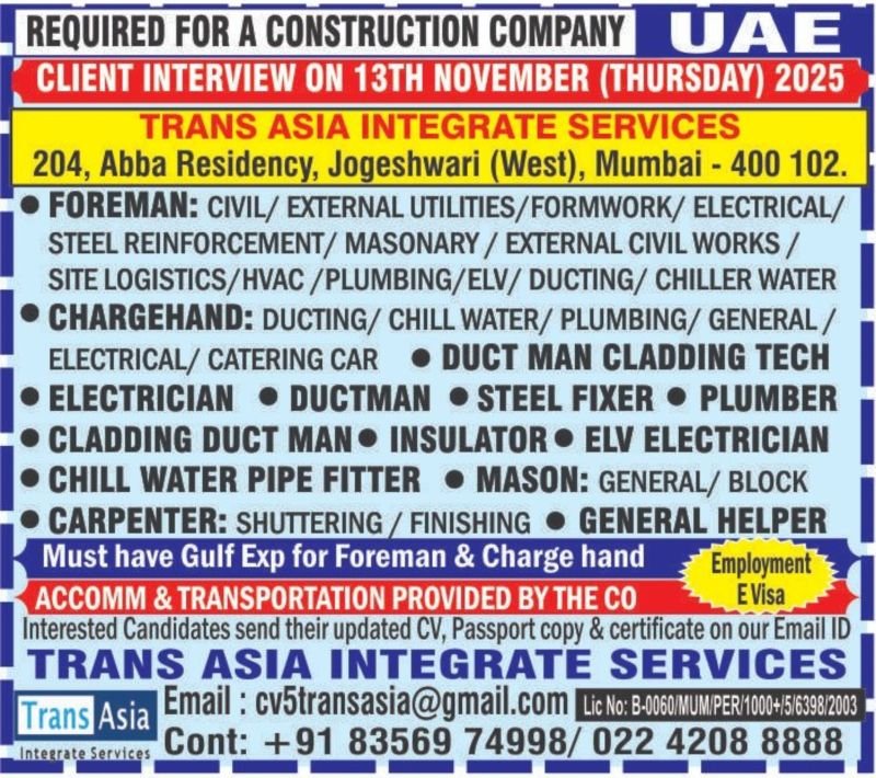 Join one of the leading Construction Companies in the UAE through Trans Asia Integrate Services!