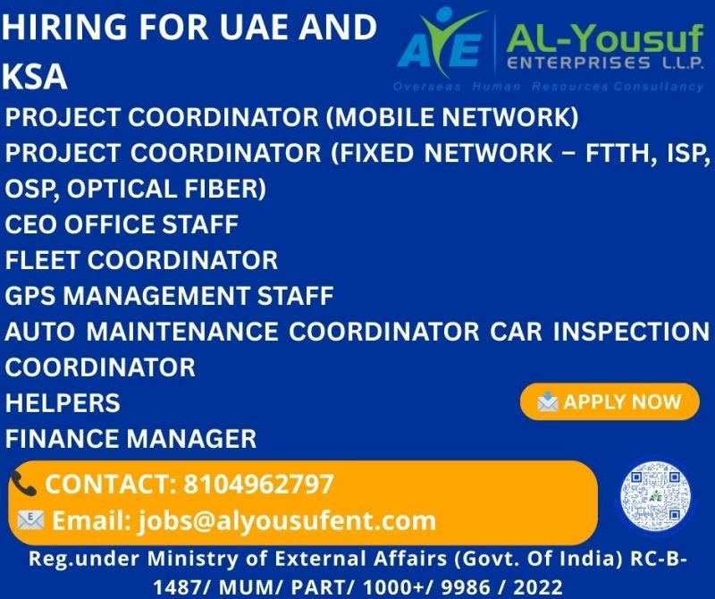 Multiple positions available including Project Coordinators, CEO Office Staff, Fleet & Maintenance Coordinators, Helpers, and Finance Manager.