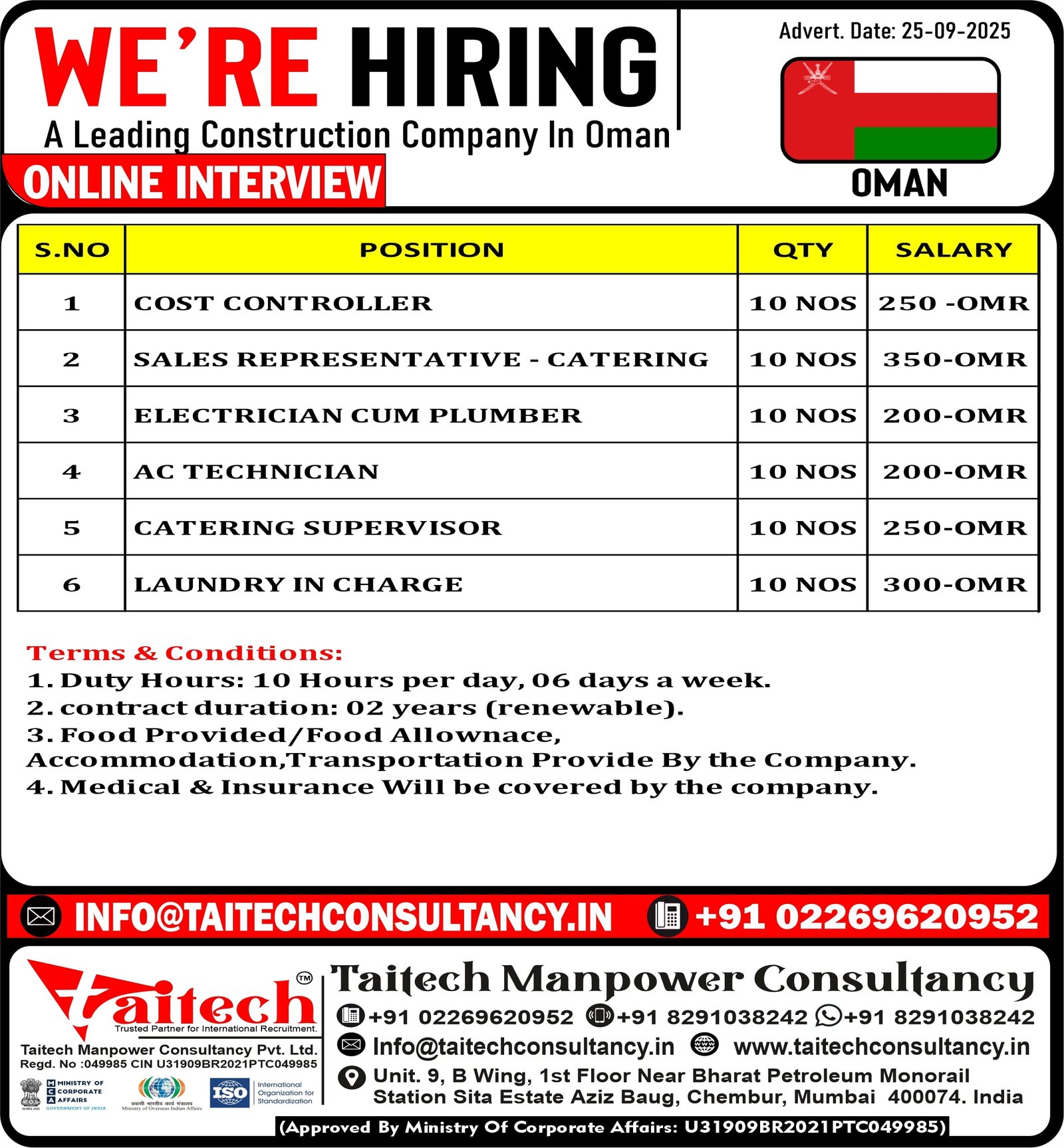 Taitech Manpower Consultancy is recruiting for a leading construction company in Oman. Attend the online interview and join a thriving workforce with excellent benefits!