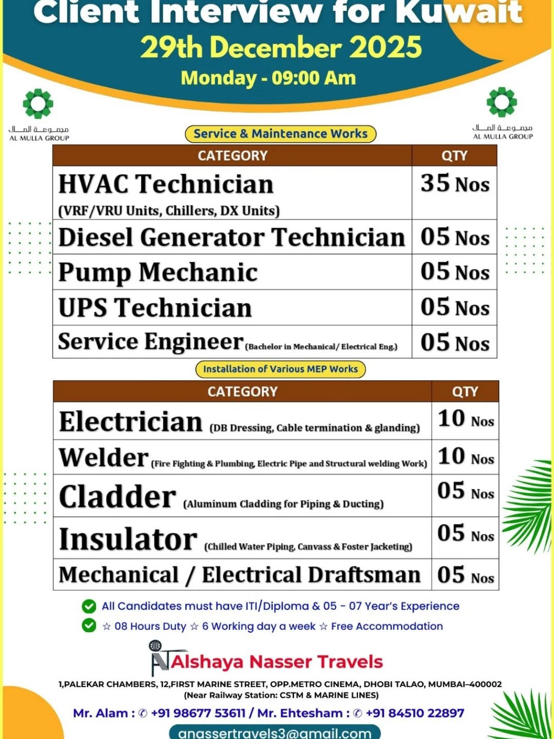 - Qualification: ITI or Diploma in Electrical/Mechanical Engineering