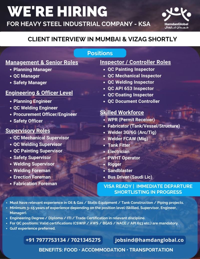 - QC Manager / Welding Engineer / Inspectors (Welding, Mechanical, Painting, Coating, API 653)