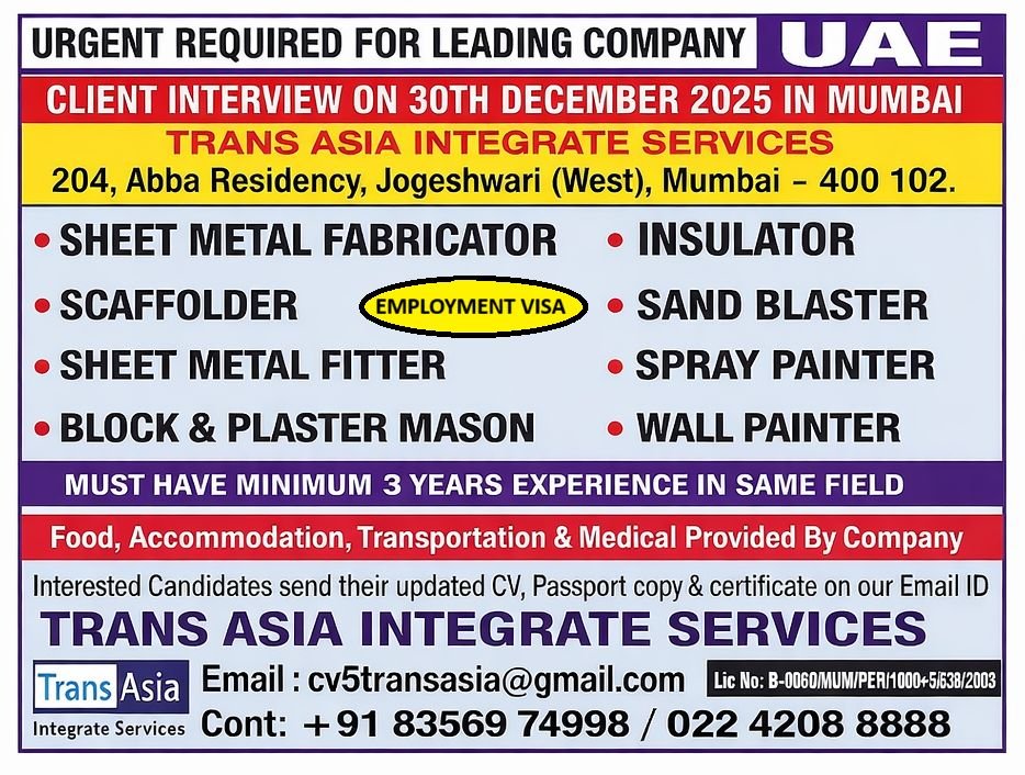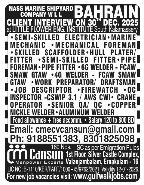 [Note: We try to provide genuine jobs .We dont have any role in Recruitment Process.Please enquiry about the Recruiting Agent before you accept the Job Offer / Pay any Money to them]