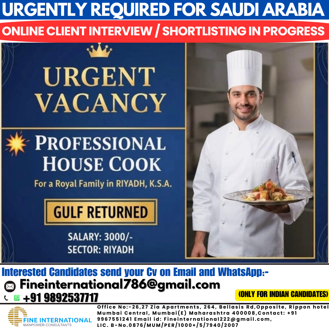 Professional House Cook Jobs Riyadh | Royal Family | 3000-4000 SAR
