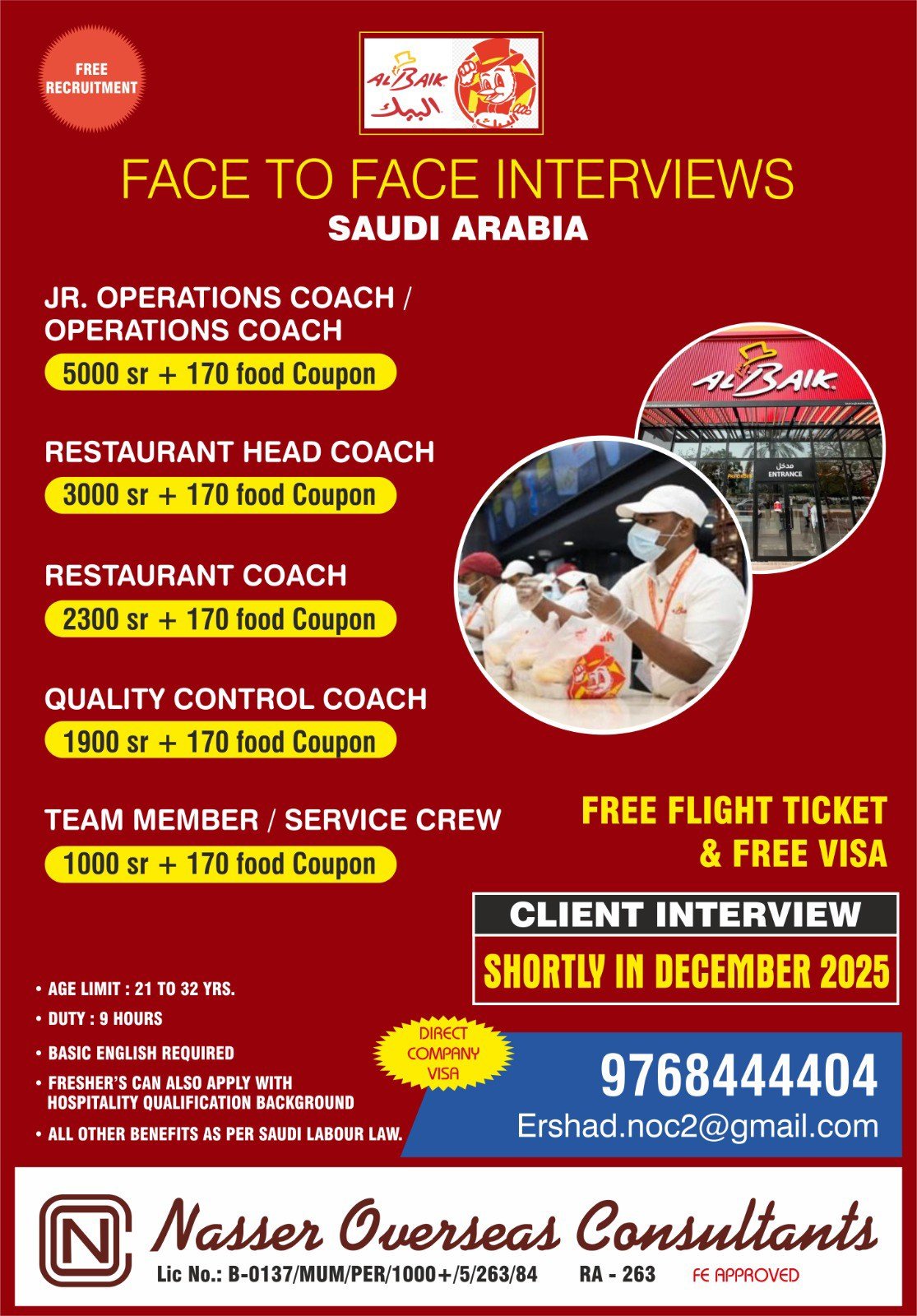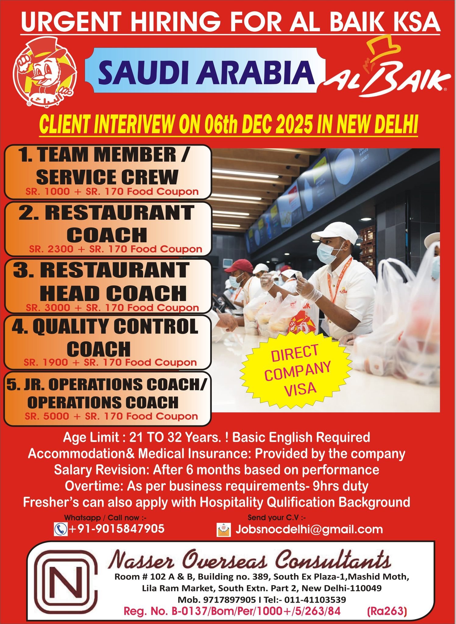 Al Baik Saudi Arabia Jobs: Team Member, Coach, Head Coach | Client Interviews 6th Dec Delhi