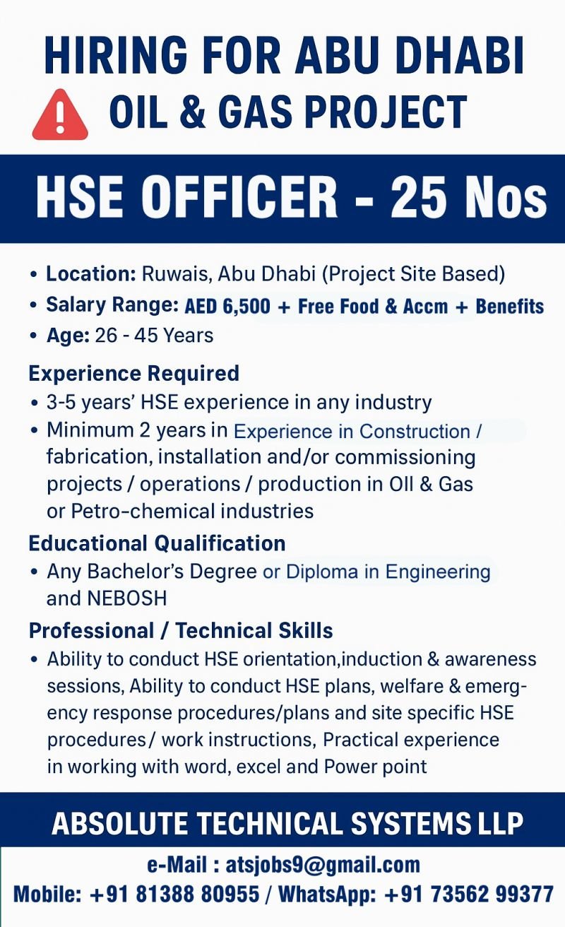 Are you looking for a rewarding career in the oil and gas industry? Absolute Technical Systems LLP is hiring 25 HSE Officers for a prestigious project in Ruwais, Abu Dhabi. This is an excellent opportunity for experienced professionals to join a dynamic team with competitive benefits.