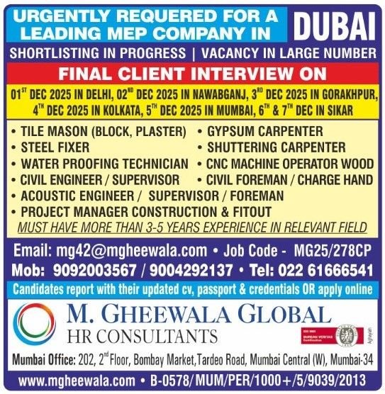 Urgent Construction & MEP Jobs in Dubai: Immediate Visa & Joining for Large Vacancies