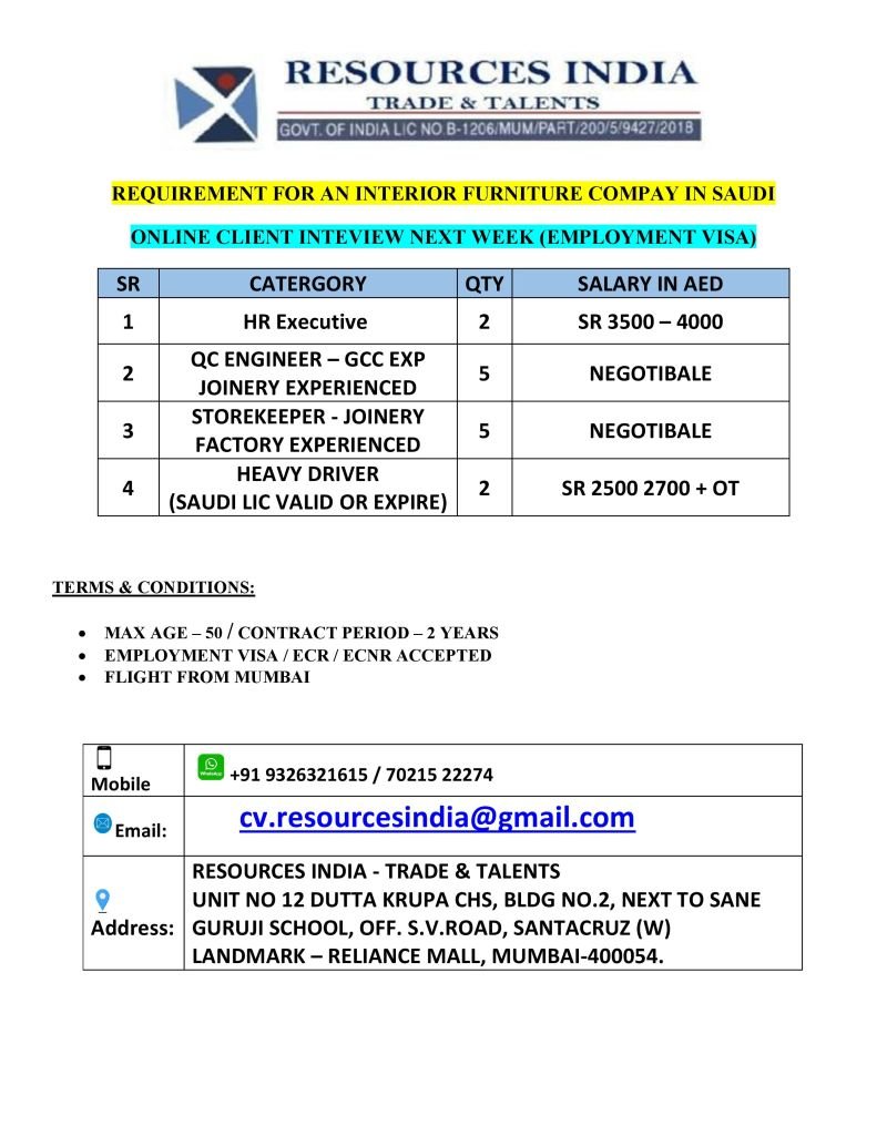 Looking for lucrative job opportunities in Saudi Arabia? An esteemed interior furniture company is hiring skilled professionals for various roles. With an online client interview scheduled next week and employment visa support, this is a golden opportunity. Check out the details below and apply today!