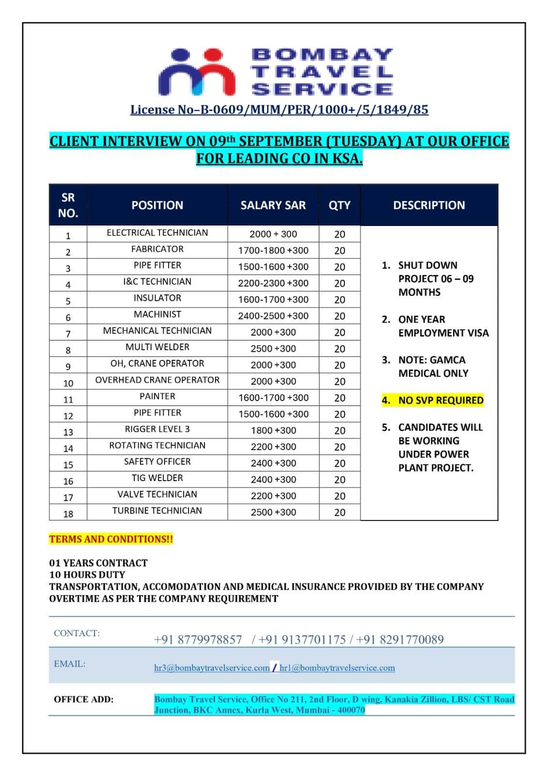 Join a leading company in KSA with exciting job opportunities! Bombay Travel Service is hosting a client interview on 9th September 2025 (Tuesday) at 08:45 PM IST at our office. Explore roles in a 01-year contract or 06-09 month shutdown project under a power plant project.