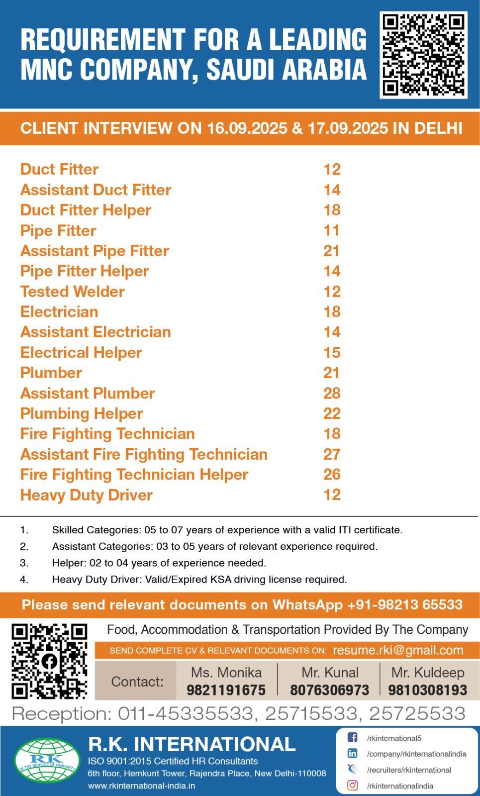 Looking for a career with a leading MNC in Saudi Arabia? Attend the client interview on 16th & 17th September 2025 in Delhi. Apply now with R.K. International!