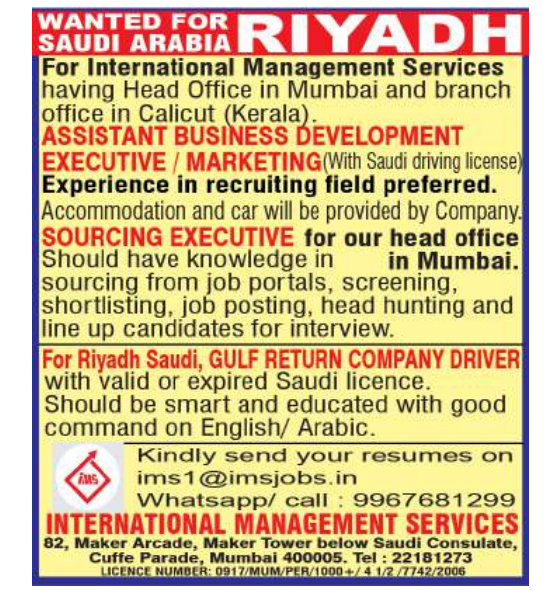 Looking for job opportunities in Saudi Arabia? Riyadh International Management Services, with its head office in Mumbai and a branch office in Calicut (Kerala), is hiring talented individuals. Apply now for exciting roles in Riyadh and Mumbai!