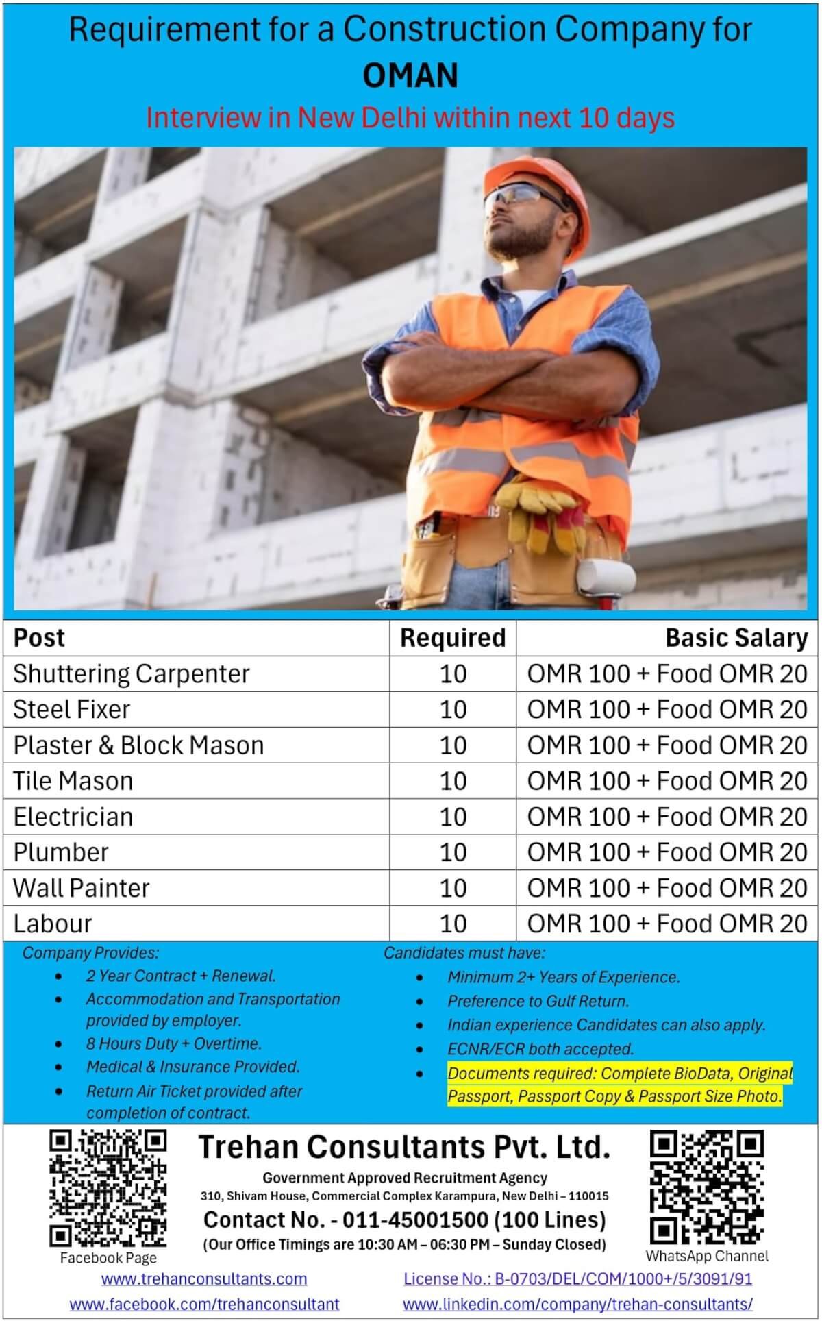 Trehan Consultants Pvt. Ltd., a government-approved recruitment agency, is hiring for a leading construction company in Oman. Interviews will be held in New Delhi within the next 10 days. Apply now for exciting opportunities with competitive salaries and benefits!