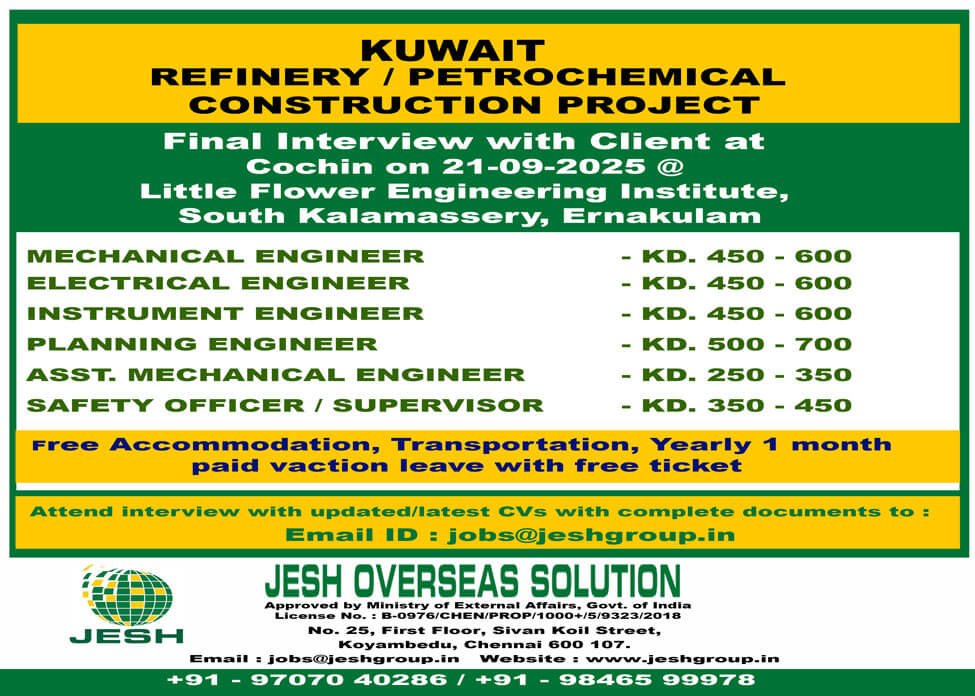 Looking for a career in the construction industry? Jesh Overseas Solution is hosting a final interview with the client on 21-09-2025 in Cochin for the Kuwait Refinery/Petrochemical Construction Project. Apply now!