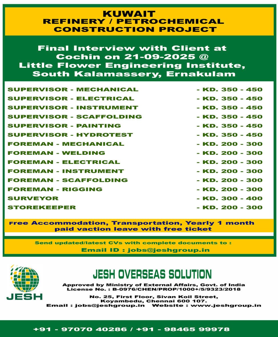 Looking for a career in the construction industry? Jesh Overseas Solution is hosting a final interview with the client on 21-09-2025 in Cochin for the Kuwait Refinery/Petrochemical Construction Project. Apply now!