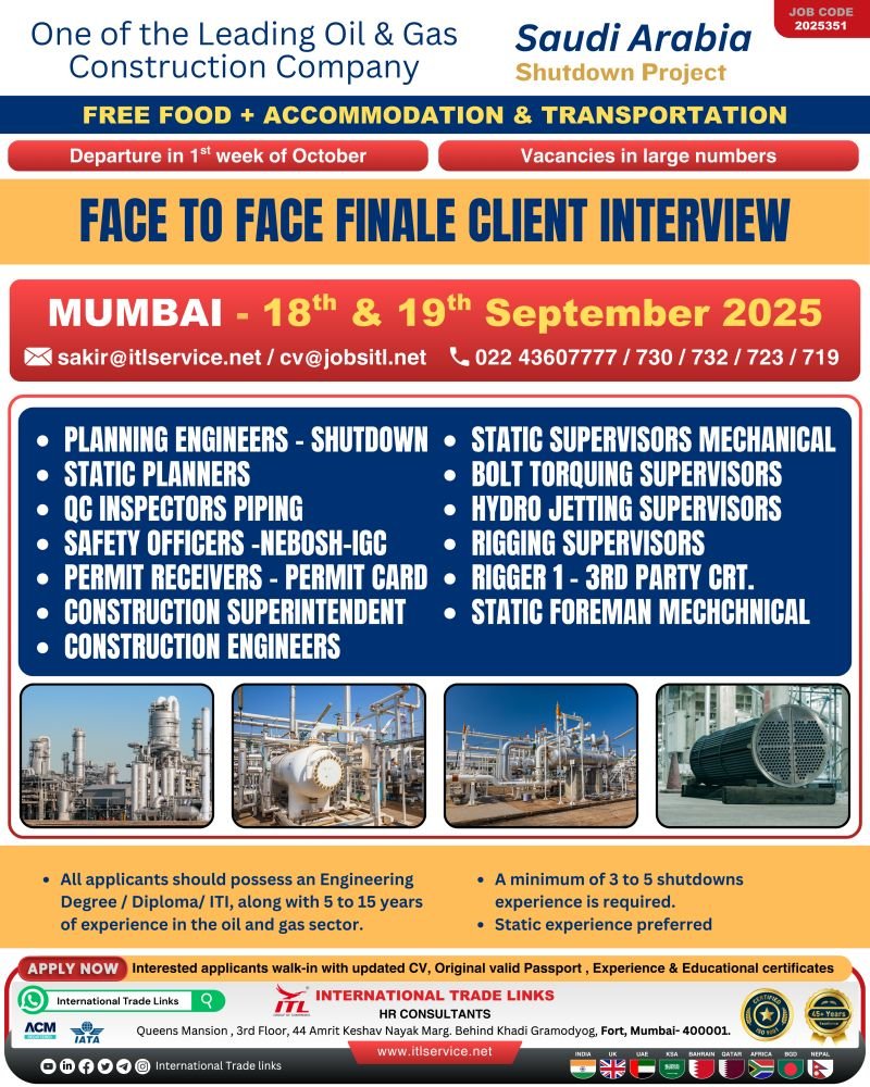 Looking for a career in the oil and gas sector? One of the leading oil and gas construction companies in Saudi Arabia is hiring for a shutdown project. Attend the face-to-face final client interview on 18th & 19th September 2025 in Mumbai. Apply now!