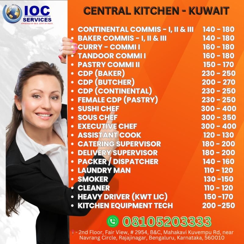 IOC Services, an MEA-approved company, is hiring for various roles at a central kitchen in Kuwait. Apply now for competitive salaries and long-term career prospects!