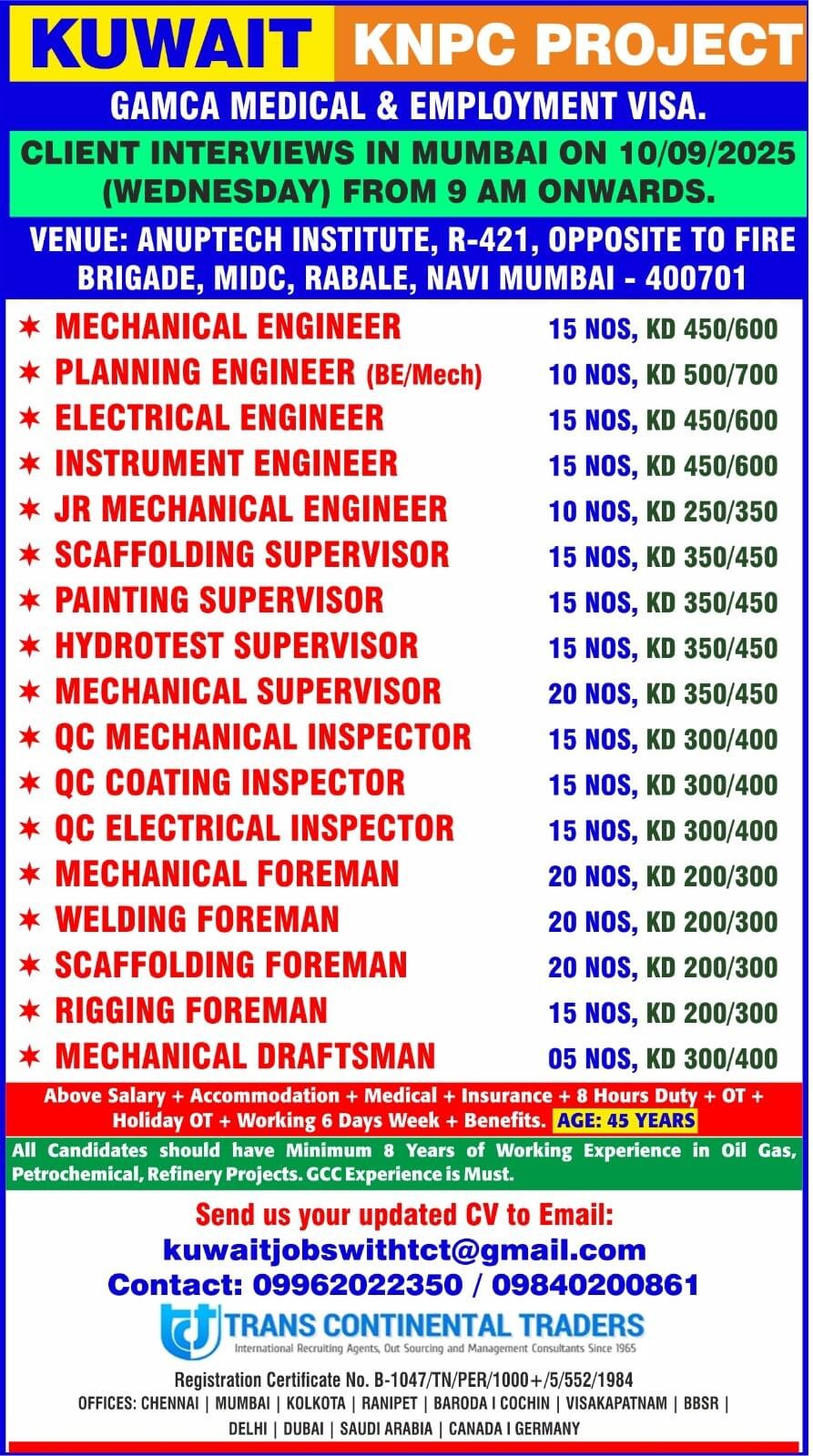 Are you an experienced professional in the oil and gas industry? client interviews in Mumbai on 10/09/2025 (Wednesday) from 9 AM onwards for various roles in their Kuwait project. Apply now for positions like Mechanical Engineer, Electrical Engineer, and more!