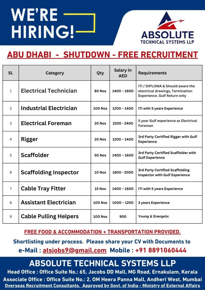 Are you looking for lucrative job opportunities in Abu Dhabi? Absolute Technical Systems LLP is conducting a free recruitment drive for various skilled positions during the shutdown period. With competitive salaries, free food, accommodation, and transportation provided, this is a golden chance to advance your career!