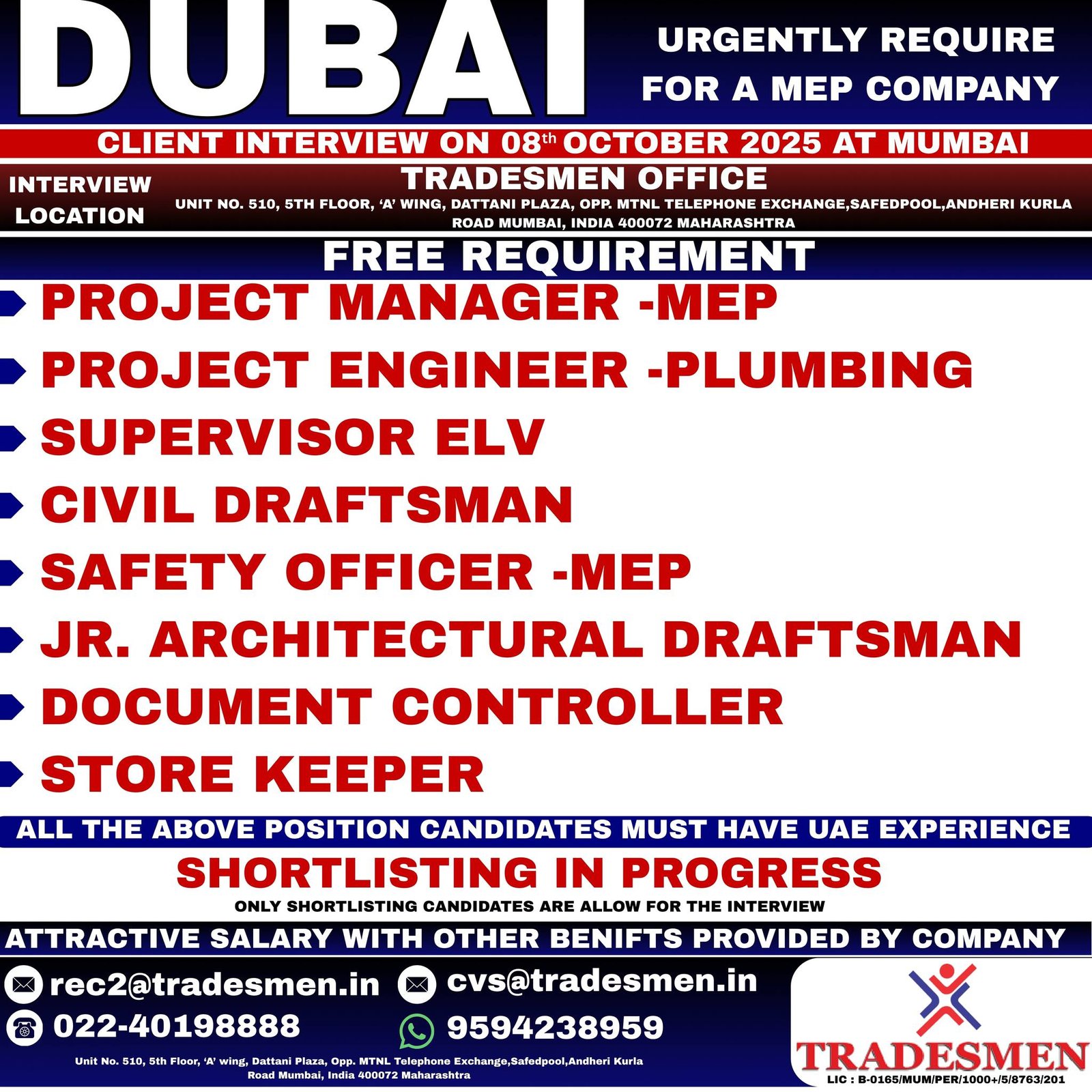 Are you looking for lucrative career opportunities in Dubai? A leading MEP (Mechanical, Electrical, and Plumbing) company is urgently hiring for multiple roles. The client interview is scheduled for 08th October 2025 at Mumbai. Read on to explore the vacancies, requirements, and how to apply!