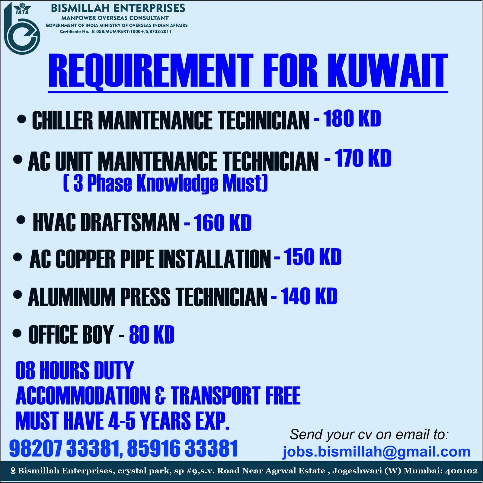 Bismillah Enterprises, a government-approved manpower overseas consultant, is hiring for a leading company in Kuwait. Apply now for these exciting roles!