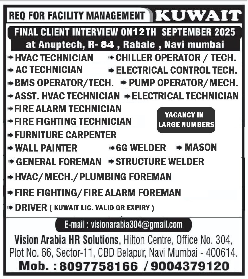 Looking for a career in facility management? Vision Arabia HR Solutions is conducting a final client interview on 12th September 2025 at Anuptech, R-84, Rabale, Navi Mumbai. Explore exciting job openings in Kuwait with vacancies in large numbers!