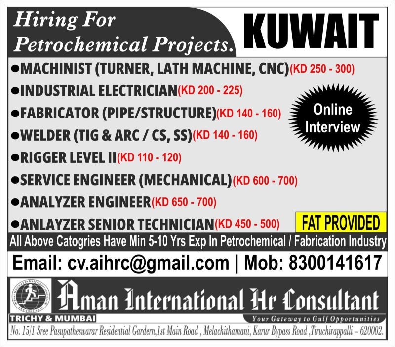 Looking for a career in the petrochemical industry? Aman International Hr Consultant is hiring for various roles in Kuwait. Online interviews are ongoing, and FAT (Free Accommodation and Transportation) is provided. Apply now!