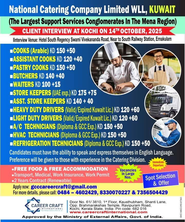 Looking for exciting job opportunities in Kuwait? National Catering Company Limited WLL, the largest support services conglomerate in the Mena region, is conducting a client interview on 14th October 2025 at Kochi. With immediate departure and spot selection, apply today!