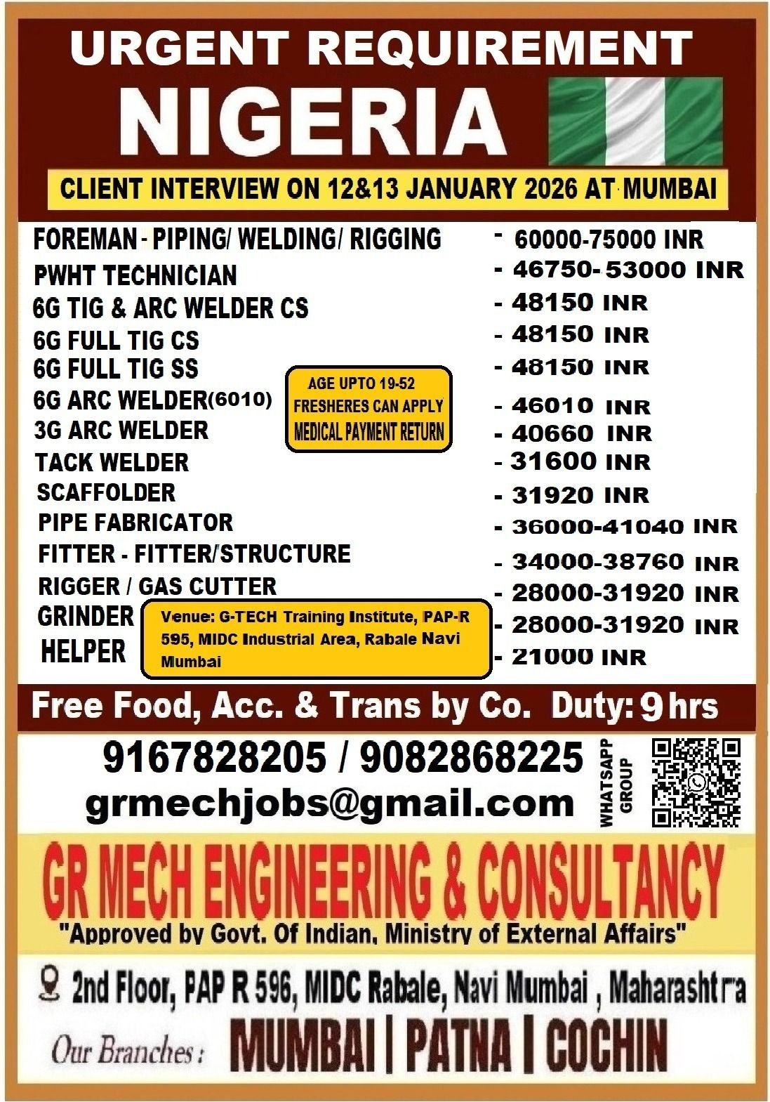 Are you a skilled welder, pipe fitter, rigger, or foreman looking for overseas jobs in Africa? A reputed company in Nigeria is urgently hiring experienced and fresh candidates for long-term projects. This is a great chance with competitive INR salaries, free benefits, and even freshers eligible for some roles!