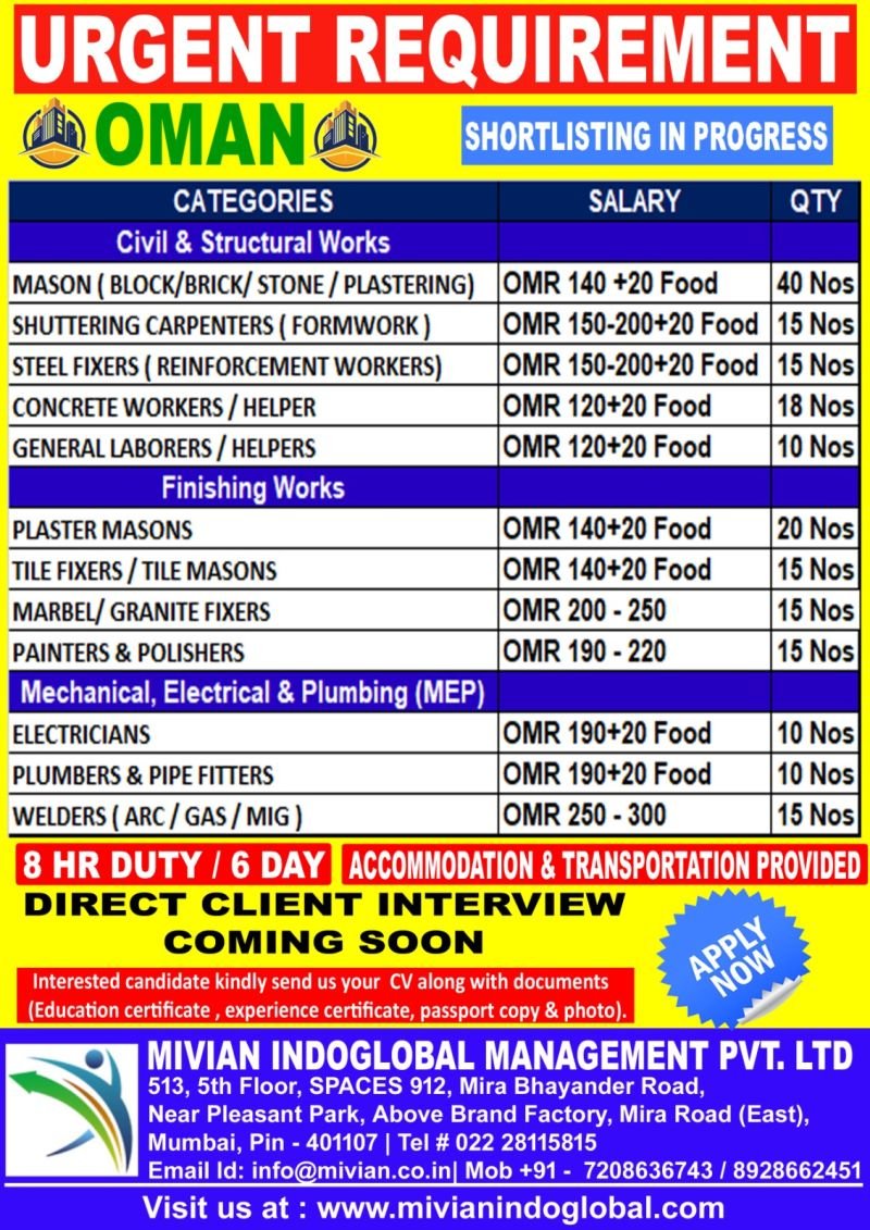 Are you looking for urgent job opportunities in 2025? Mivian Indoglobal Management Pvt. Ltd. is currently shortlisting candidates for a large-scale project in Oman. With a direct client interview coming soon, attractive salaries, and benefits like free food, accommodation, and transportation, this is an excellent chance to join the workforce. Explore the available positions and learn how to apply below.