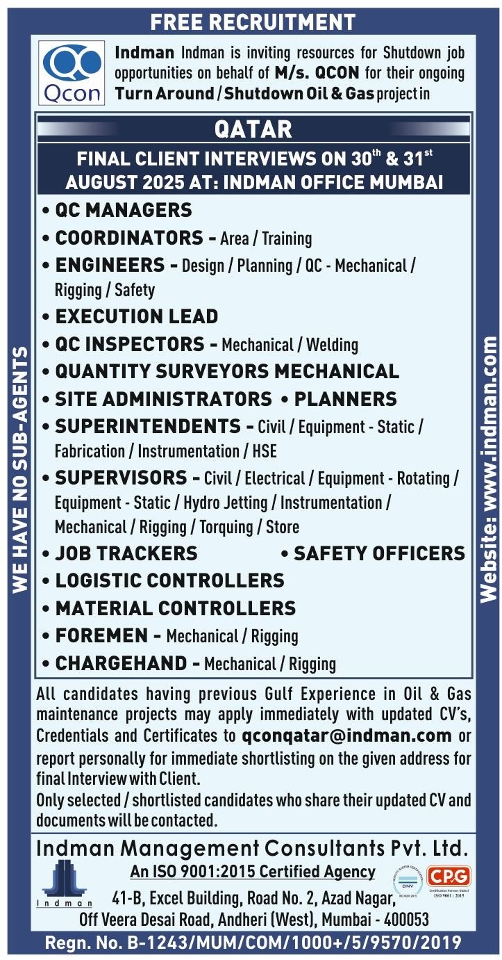 Indman Management Consultants Pvt. Ltd., an ISO 9001:2015 certified agency, is inviting experienced professionals for shutdown job opportunities in Qatar on behalf of M/s. QCon for their ongoing Turn Around/Shutdown Oil & Gas project. Final client interviews are scheduled for 30th & 31st August 2025 at Indman Office Mumbai.