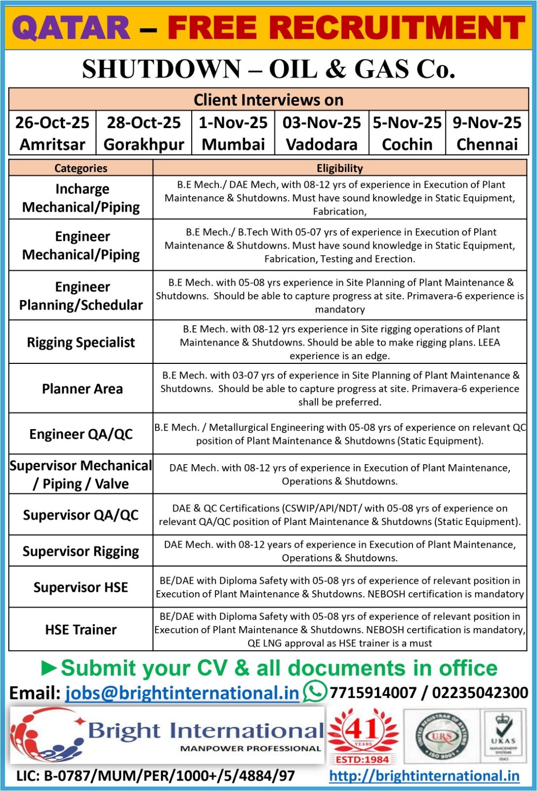 Are you looking for urgent job opportunities in 2025? Bright International is conducting free recruitment for a shutdown project with a leading oil and gas company in Qatar. With client interviews scheduled across multiple cities from 26th October to 9th November 2025, this is a prime chance to join a prestigious project. Explore the available positions and learn how to apply below.