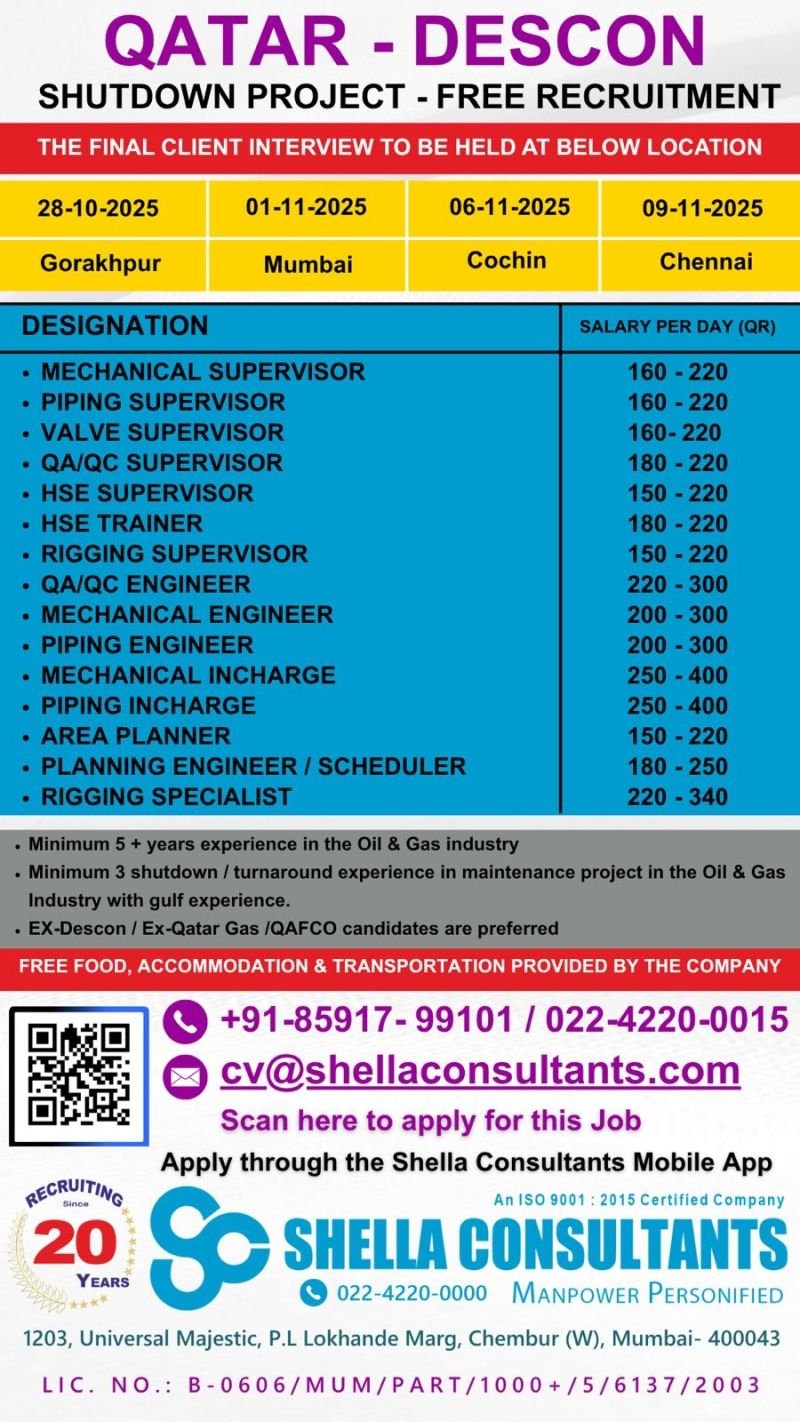 Are you an experienced professional in the Oil & Gas industry looking for a lucrative career opportunity? The Qatar-Descon Shutdown Project is offering free recruitment for various roles with attractive daily salaries in QAR. The final client interviews are scheduled at multiple locations across India. Read on to learn more about the designations, salaries, and how to apply!