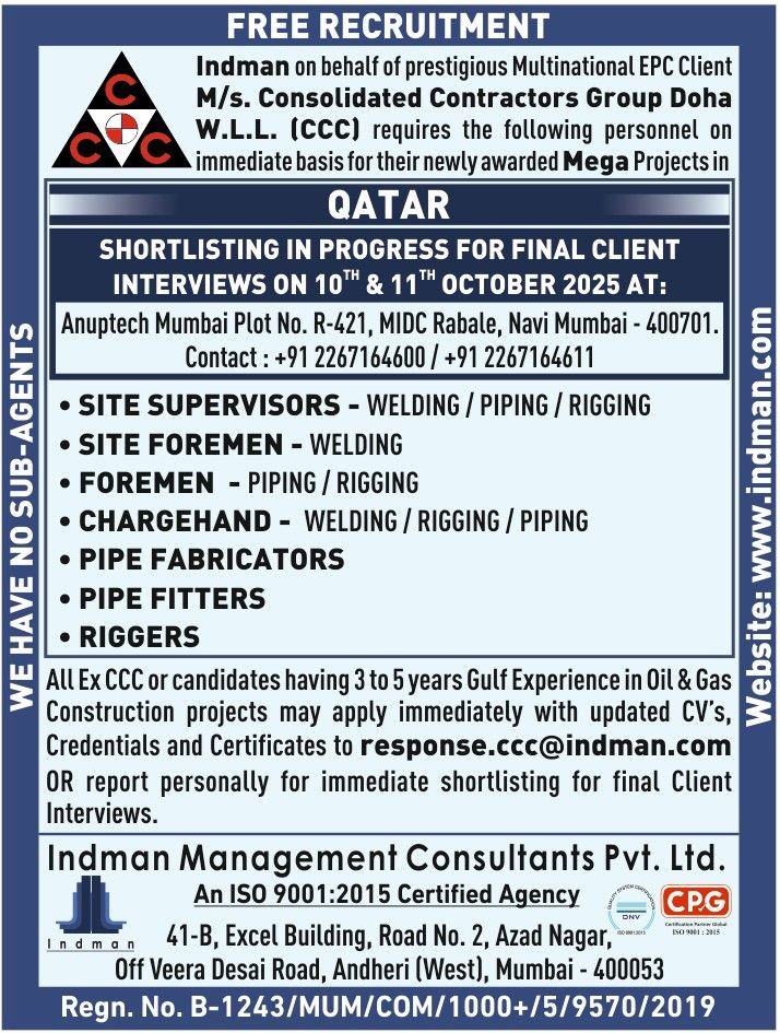 Looking for a career opportunity in Qatar? Indman Management Consultants Pvt. Ltd., on behalf of W.L.L. Consolidated Contractors Group Doha (CCC), is conducting final client interviews on 10th & 11th October 2025 at Mumbai. With free recruitment and immediate shortlisting, apply today!