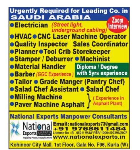 National Exports Manpower Consultants is a leading manpower recruitment agency based in Kohinoor City Mall, 1st Floor, Gala No. F96, Kuria (W). With a strong reputation, we connect skilled professionals with top employers in Saudi Arabia and beyond.