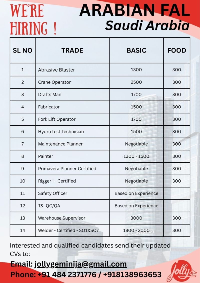 Looking for a career boost in Saudi Arabia? Arabian Fal is hiring for various skilled trades with competitive salaries. Apply today and seize this opportunity!
