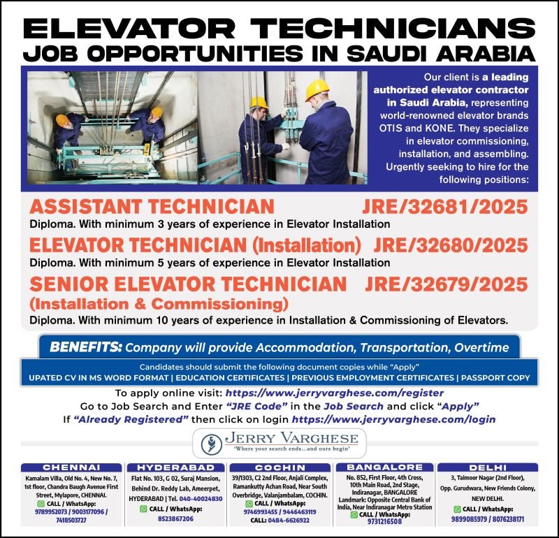 Looking for a rewarding career in Saudi Arabia? Jerry Varghese is hiring Elevator Technicians for a leading contractor authorized by world-renowned elevator brands OTIS and KONE. Specializing in elevator commissioning and installation, they are urgently seeking candidates for the following positions.