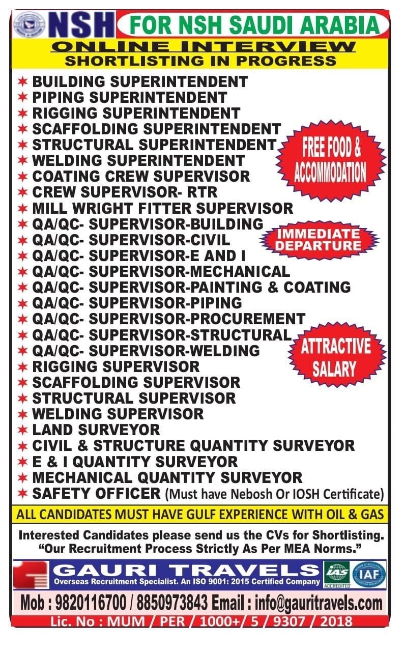 Looking for lucrative job opportunities in Saudi Arabia? NSH, in collaboration with Gauri Travels, is conducting an online interview with shortlisting in progress for various supervisory and technical roles. Apply now for immediate departure with attractive salaries, free food, and accommodation!