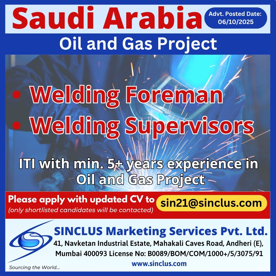 Looking for a career in the oil and gas sector in Saudi Arabia? Sinclus Marketing Services Pvt. Ltd. is hiring for Welding Foreman and Welding Supervisors. Posted on 06/10/2025, this is your chance to join a prestigious project. Apply today!