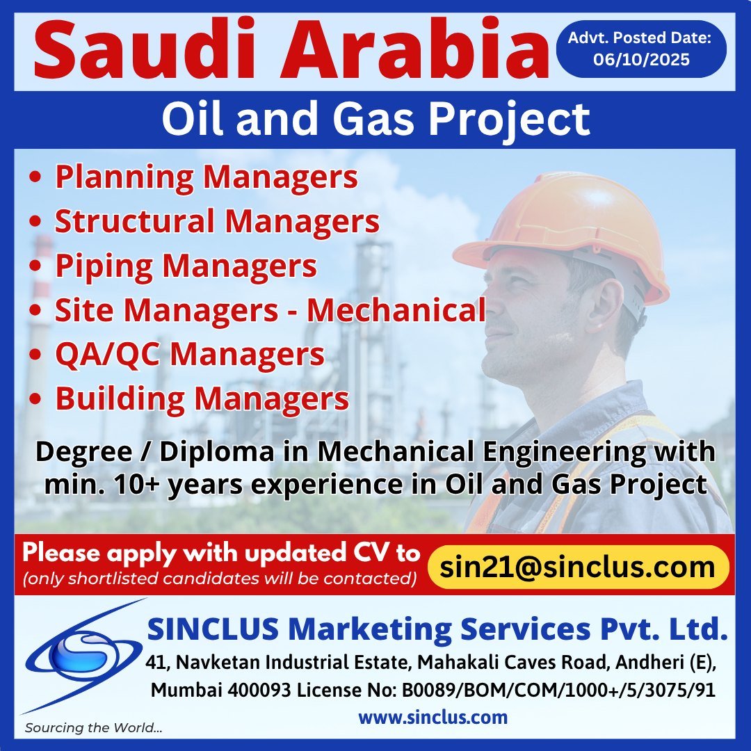 Looking for a career in the oil and gas sector in Saudi Arabia? Sinclus Marketing Services Pvt. Ltd. is hiring for multiple managerial roles. Posted on 06/10/2025, this is your chance to join a prestigious project. Apply today!