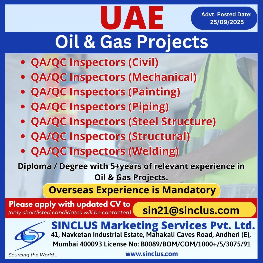 Sinclus Marketing Services Pvt. Ltd. is hiring for Oil & Gas Projects in the UAE. Apply now with your updated CV for these exciting roles!