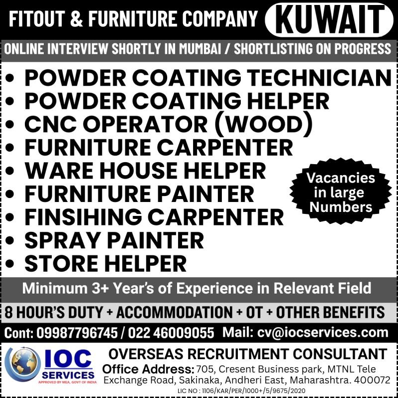 A leading fitout and furniture company in Kuwait is hiring skilled professionals for various roles. An online interview will be conducted shortly in Mumbai, with shortlisting already in progress. Apply now to join a thriving industry!