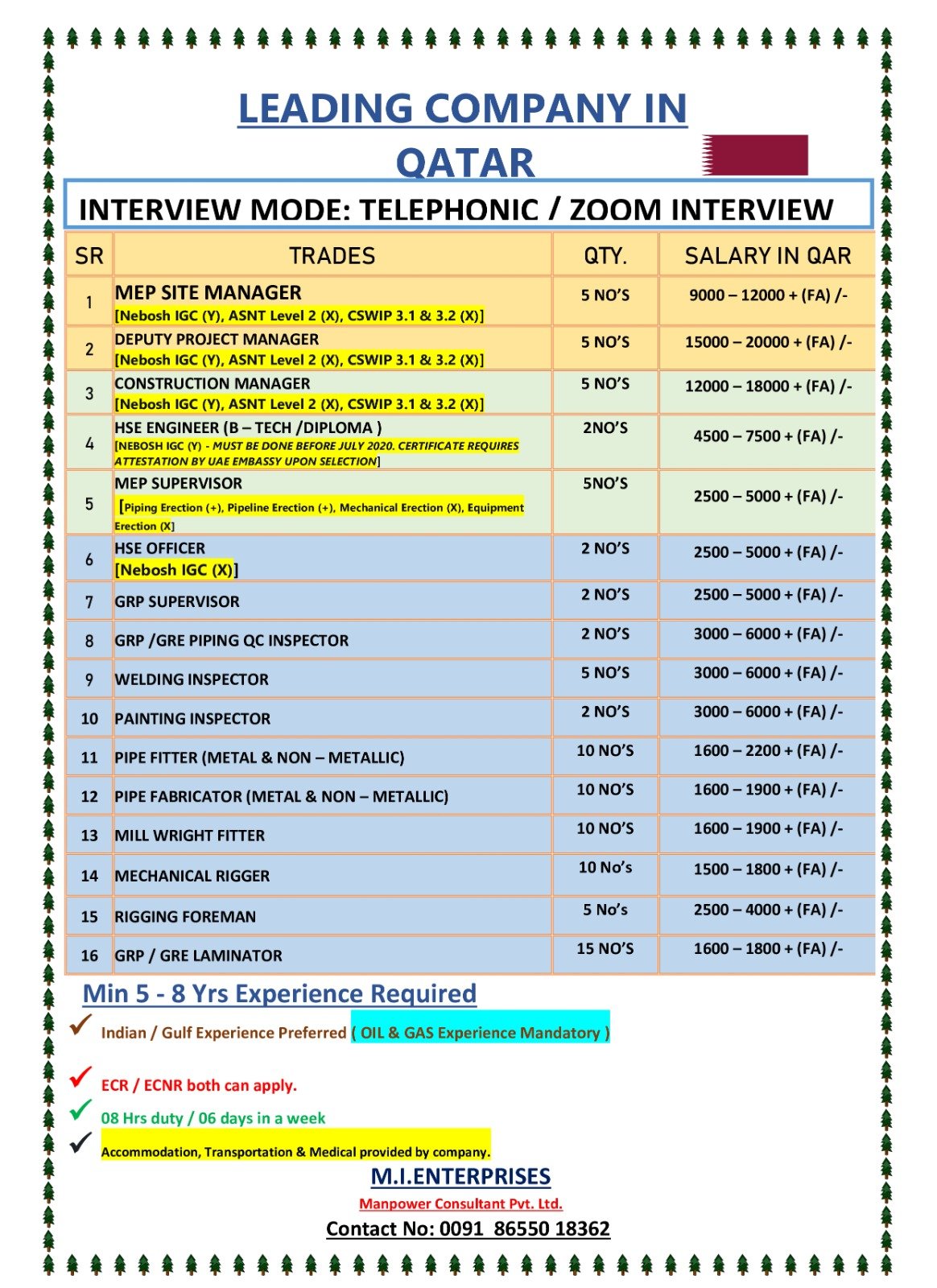 - MEP Supervisor (Piping Erection, Pipeline Erection, Mechanical Erection) – 5 Nos | Salary: QAR 2500-5000 + (FA)