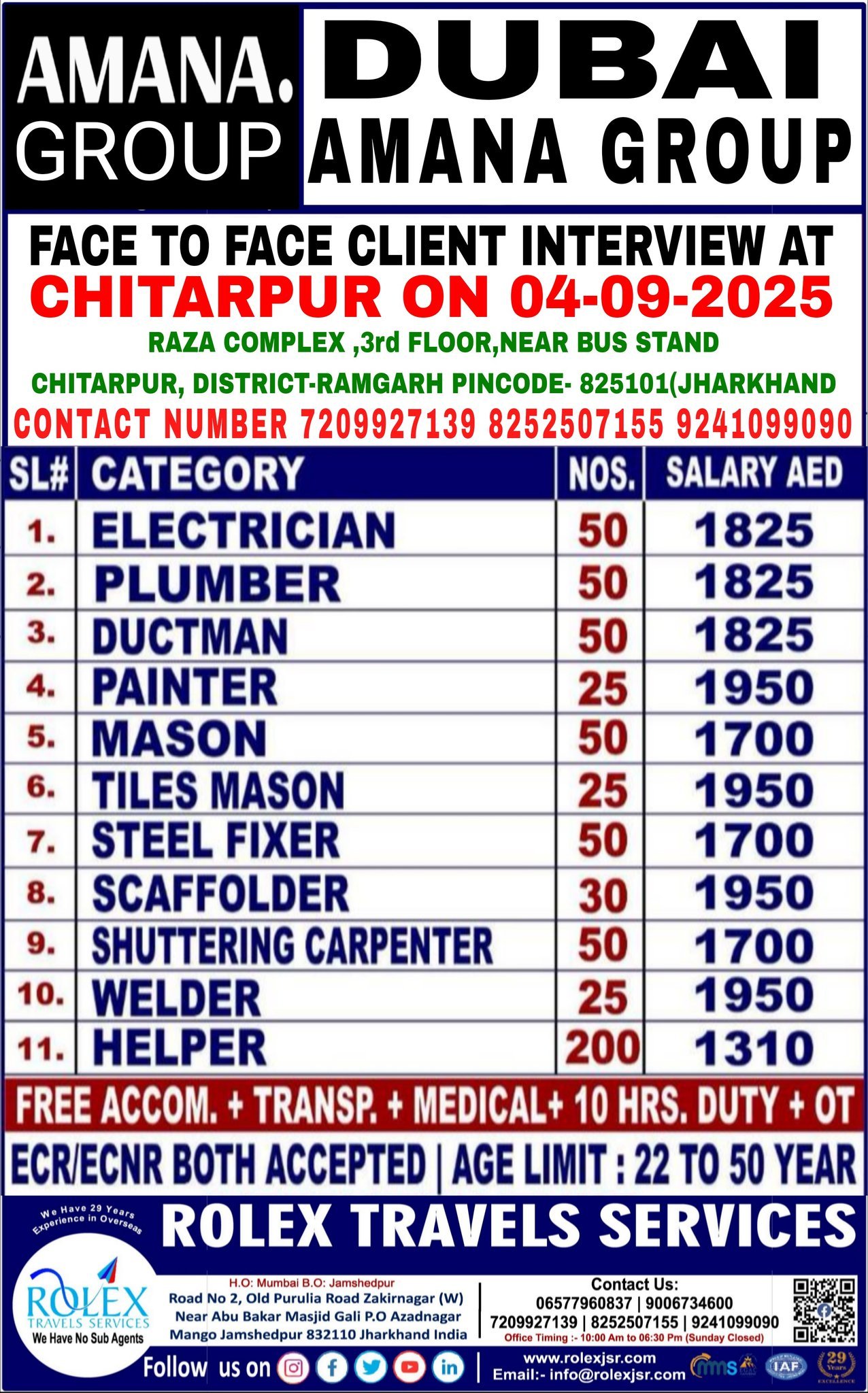 Rolex Travels Services is hosting a face-to-face client interview for Amana Group in Dubai on 04-09-2025 at Raza Complex, 3rd Floor, Near Bus Stand, Chitarpur, District-Ramgarh, Pincode-825101 (Jharkhand).