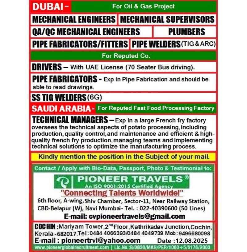 Job Vacancies For Dubai & Saudi Arabia