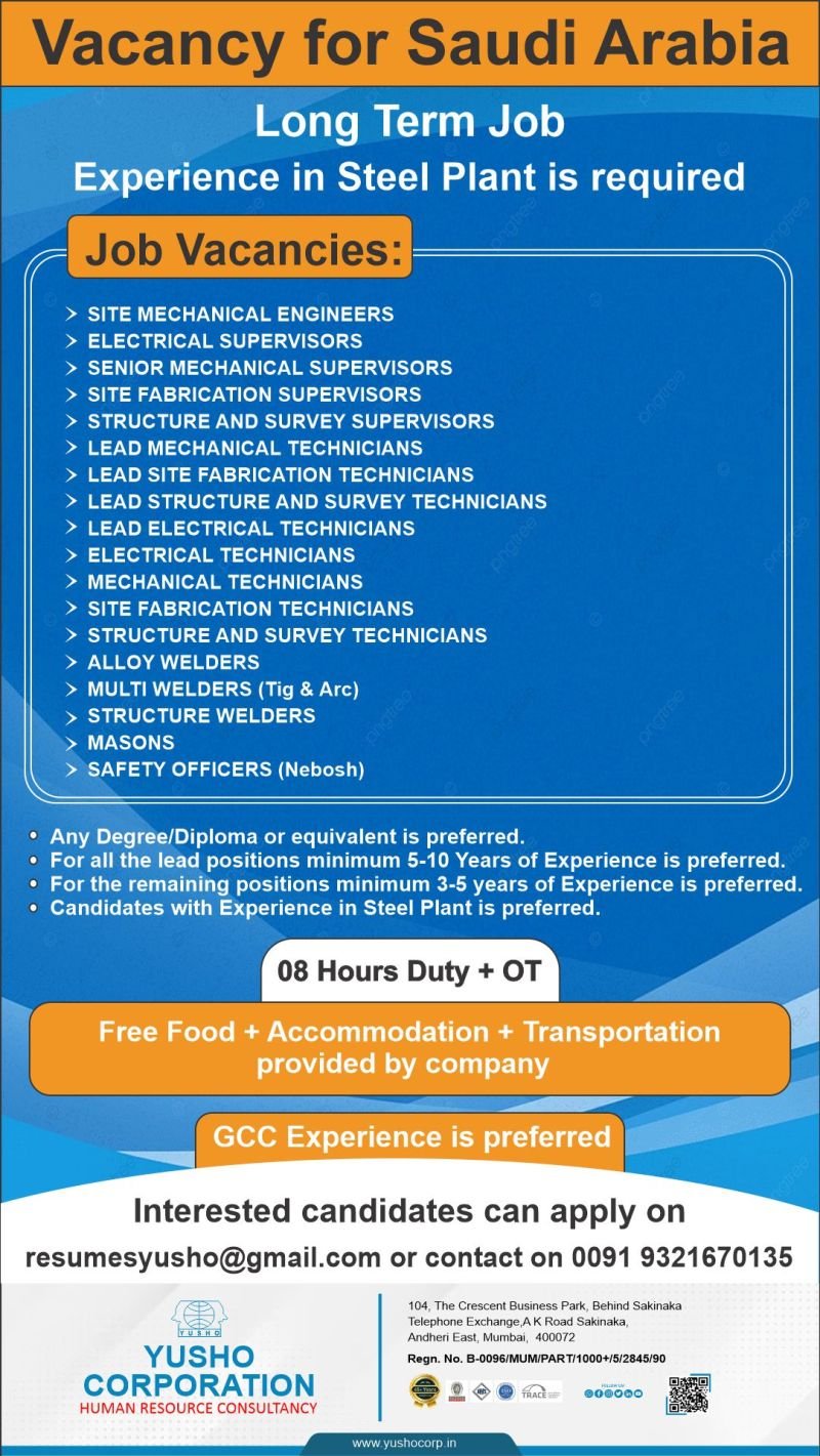 Looking for long-term job opportunities abroad? Yusho Corporation Human Resource Consultancy is offering exciting vacancies in Saudi Arabia. Experience in a steel plant is required. Apply now for a rewarding career!