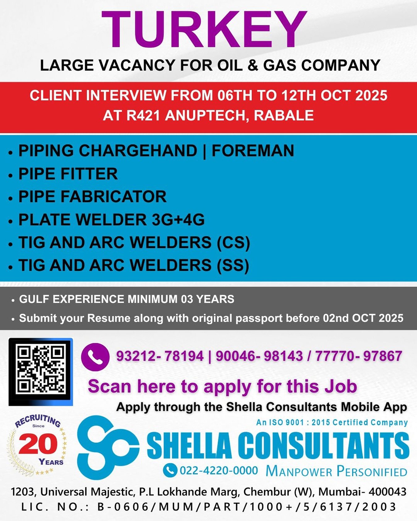 Explore exciting career opportunities with a leading Oil & Gas company in Turkey. Shella Consultants is hosting a client interview from 6th to 12th October 2025 at R421 Anuptech, Rabale. Apply now!